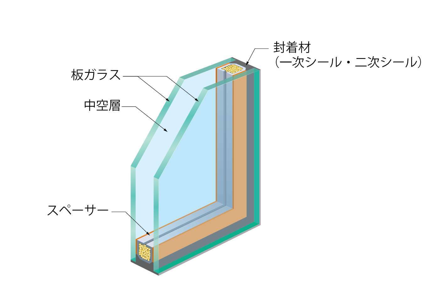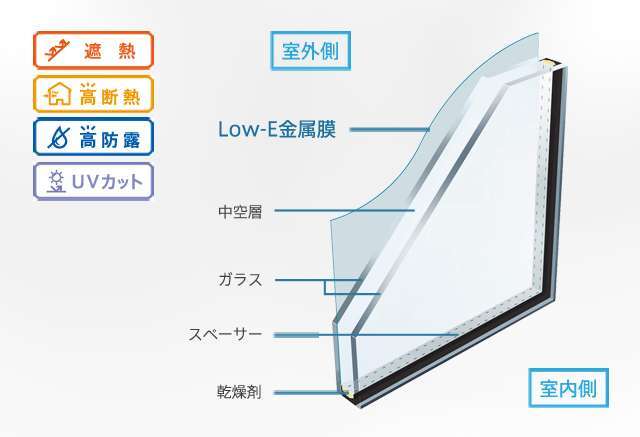 2枚のガラスの間に空気の層を閉じ込めたものです。この空気層が「断熱材」の役割を果たし、外の熱気が室内に伝わるのを防ぎます。