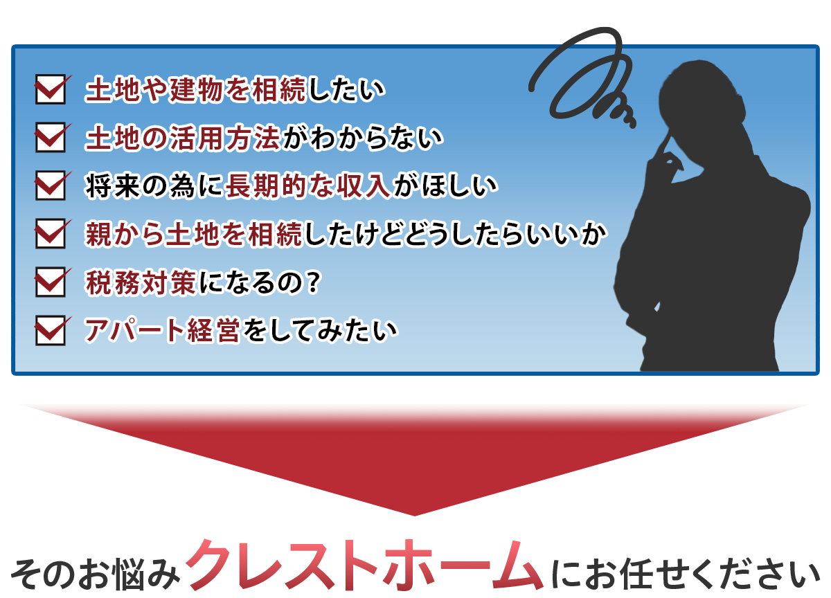 土地活用は様々なメリットが得られ、生活を豊かにしてくれます。クレストホームはあなたを支えるパートナーとなり、親身に寄り添って共に土地活用の成功を目指します。お客様の理想の活用方法や収入など、あらゆるご要望をぜひお聞かせください。